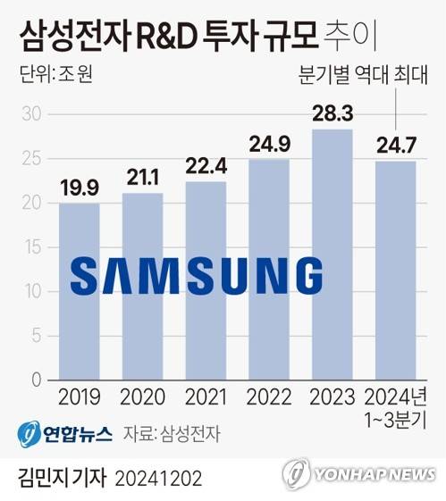 (서울=연합뉴스) 김민지 기자 = 2일 업계에 따르면 삼성전자[005930]는 지난해 연간 28조3천400억원에 이어 올해도 분기마다 연구개발(R&D) 투자 규모를 늘리고 있다.