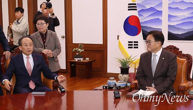 추경호 원내대표는 비공개 비상의원총회를 마치고 기자들과 만나 "날짜와 관계 없이 민주당의 (예산안 감액안 단독 처리) 사과와 철회가 우선"이라며 "그게 없이는 (12월) 10일이 아니라 20일이라도 그 어떤 협상에도 임하지 않는다는 게 확고한 입장"이라고 못을 박았다. 법정 시한이 도과하더라도 '선 사과, 후 협상' 전략을 고수하겠다는 취지로, 우원식 의장이 제시한 '10일' 기한에 얽매이지 않겠다는 뜻이다.