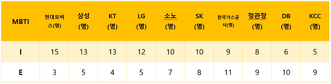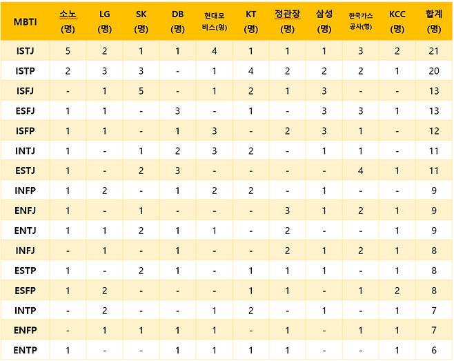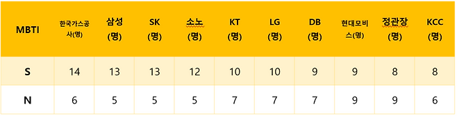 ‘ISTJ’가 16개 MBTI 중 유일하게 전 구단에서 확인된 유형인 반면, ‘ESTJ’와 ‘INTP’는 10개 구단 중 절반에 해당하는 5개 팀에서만 확인할 수 있었다.