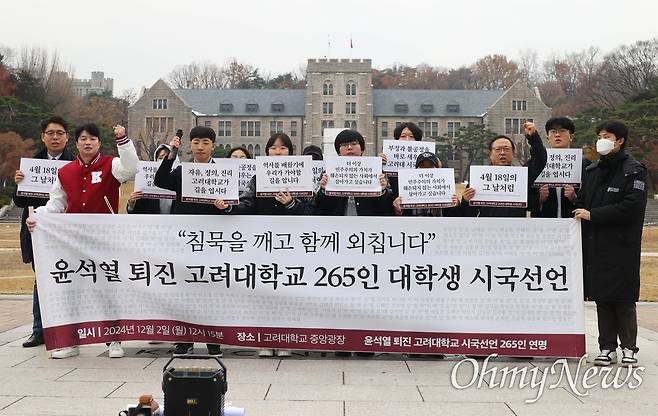 '윤석열 퇴진 고려대학교 265인 대학생 시국선언'이 2일 오후 서울 성북구 고려대 중앙광장에서 열렸다.