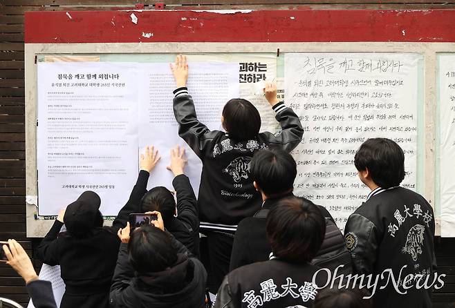 | ▲ ‘윤석열 퇴진 고려대학교 265인 대학생 시국선언’이 2일 오후 서울 성북구 고려대 중앙광장에서 열린 가운데, 기자회견을 마친 학생들이 정경대 후문 대자보판에 선언문을 게시하고 있다. |