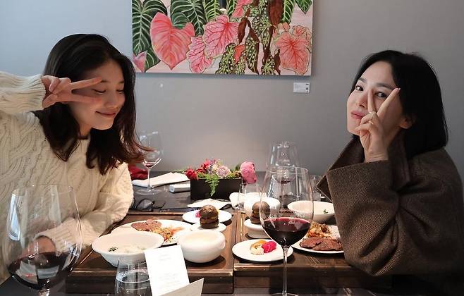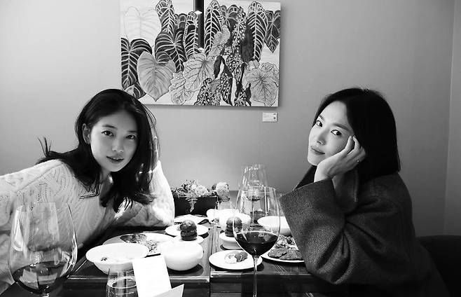 사진에는 송혜교와 수지가 분위기 좋은 레스토랑에서 만찬을 즐기고 있는 모습이 담겼다.