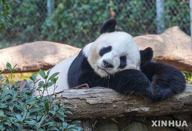 [난징=신화/뉴시스] 1일(현지시각) 중국 저장성 난징의 탕산 관광지에 있는 한 야생 동물원에서 자이언트 판다 '푸후'가 침을 흘리며 낮잠을 자고 있다. 중국 자이언트판다 보호연구센터에서 온 자이언트 판다 7마리가 공개돼 많은 방문객이 몰려들었다. 2024.12.02.