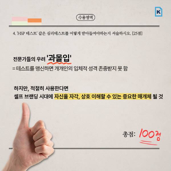 이런 테스트는 ‘가벼운 재미’로 받아들이는 것이 바람직하다. 상황과 환경, 검사 당시의 기분에 따라 결과가 달라질 수 있기 때문이다. 전문가들은 MBTI와 HSP 같은 개념을 크게 신뢰하지 않는다. 이런 테스트를 맹신하면 개개인의 입체적인 성격을 존중받지 못하고, 오히려 틀에 가두게 될 위험이 있다고 강조한다. HSP 테스트를 통해 자신이 초민감자임을 알게 되면, 예민함을 받아들이고 이를 강점으로 활용하여 긍정적인 기질로 만들 수 있다. 적절히 사용한다면, HSP와 같은 심리학적 개념은 셀프 브랜딩 시대에 자신을 자각하고, 서로를 이해할 수 있는 중요한 매개체가 될 것이다.