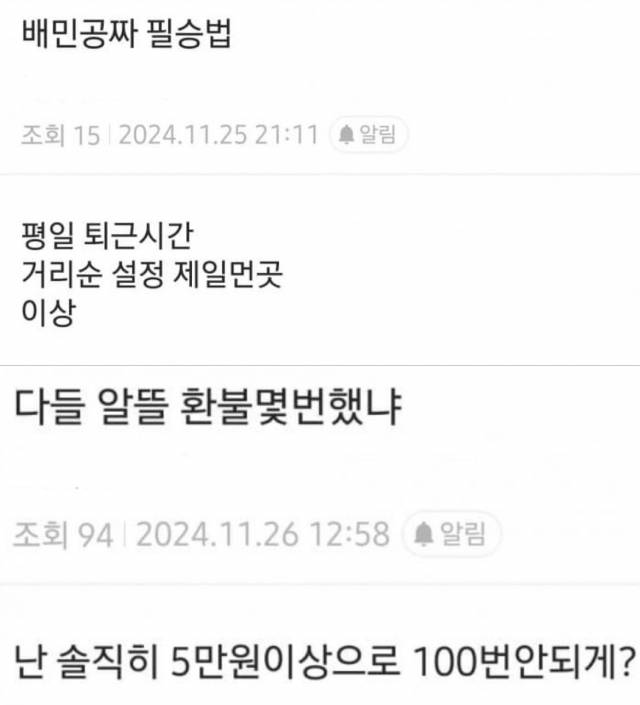 이들은 스스로를 ‘배민거지’ ‘알뜰거지’라 칭하며 “가장 먼 곳에서 주문이 많을 시간에 시키면 알뜰배달은 99% 늦는다”고 말했다. 커뮤니티에는 “이 방법으로 이때까지 50만원 정도의 이득을 봤다”는 증언도 등장했다.