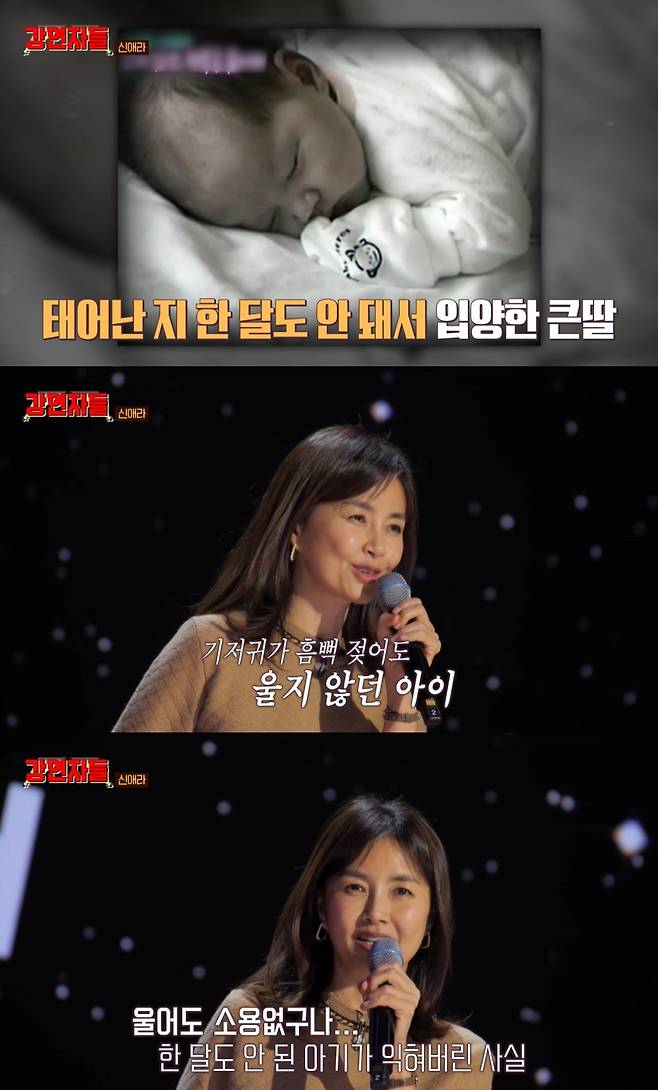앞서 신애라는 지난달 24일 방송한 MBC '심장을 울려라 강연자들'에 출연해 두 딸을 입양한 경험을 바탕으로 입양 가족의 이야기를 진솔하게 전한 바 있다. 큰딸과의 첫 만남에서 "기저귀가 흠뻑 젖어도 울지 않는 모습에 가슴이 아팠다"며 신체적 접촉과 사랑을 통해 조금씩 변화를 만들어낸 순간을 떠올렸다.