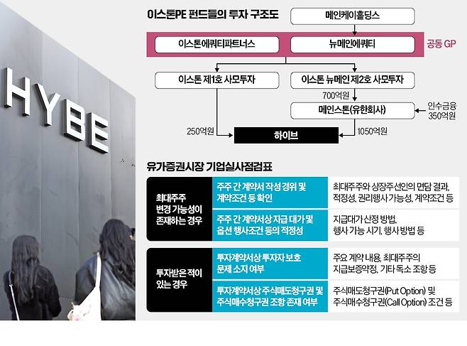 하지만 주주 간 계약서를 몰랐어도 신생 PEF를 둘러싸고 의심할 만한 사안이 한두 개가 아니었다. 방 의장 측근이 세운 이스톤에쿼티파트너스(이스톤PE) 등기부등본만 떼어봤어도 주주 간 계약의 실체가 드러났을 가능성이 높다. 이번 하이브 사태로 상장 첫 관문인 거래소의 부실 심사가 도마에 올랐다.