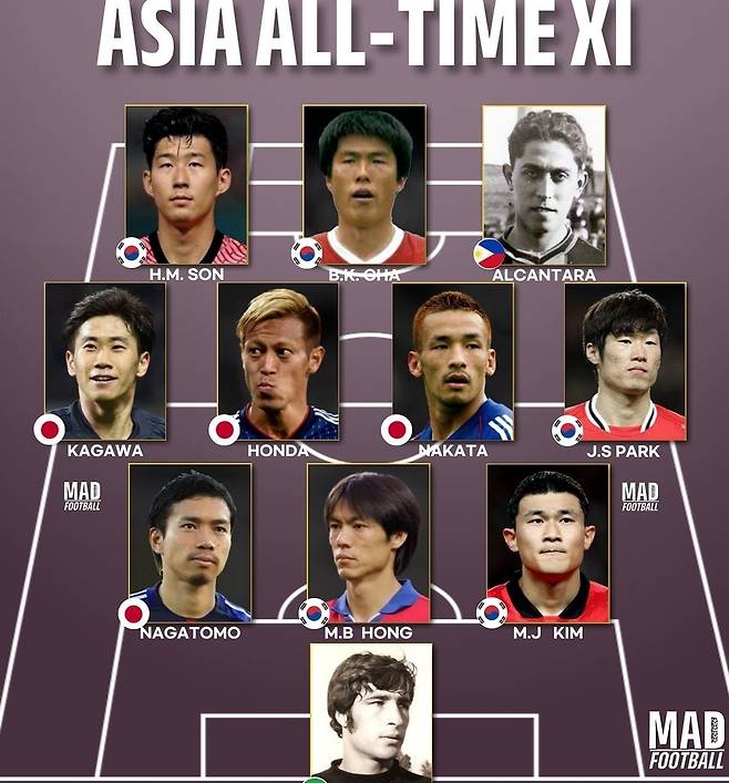 한 축구매체가 역대 아시아 '올타임 베스트11'을 선정하면서 절반에 가까운 5명을 태극전사들로 채웠다.