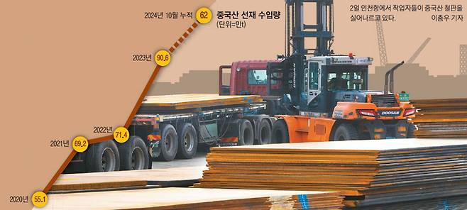 철강업계는 중국산 저가 철강재 유입에 따른 직격탄으로 해석한다. 한국철강협회에 따르면 중국산 후판 수입 물량은 2021년 47만t에서 지난해 131만t으로 2년 사이에 3배 가까이 급증한 것으로 나타났다. 올 들어 10월까지 수입 물량은 104만t으로 지난해와 비슷한 수준을 보일 것으로 전망된다. 중국산 선재 연 수입량은 지난해 약 91만t으로, 2020년(55만t) 대비 65%나 늘었다. 올 들어 10월까지는 62만t으로 집계됐다.