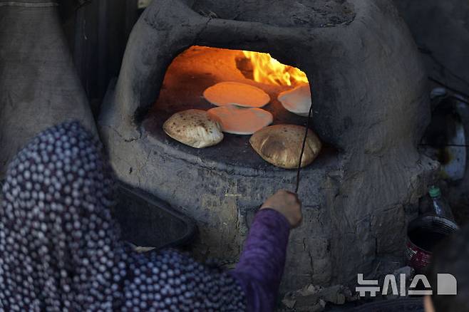 [데이르 알발라=AP/뉴시스] 2일(현지시각) 가자지구 데이르 알발라에서 한 팔레스타인 여성이 진흙 화덕으로 전통 빵을 굽고 있다. 가자지구로 향하는 지원 물품이 잇따라 도난·약탈당해 유엔(UN)이 구호 물자 전달을 임시 중단하면서 가자지구는 심각한 식량 부족을 겪고 있다. 2024.12.03.