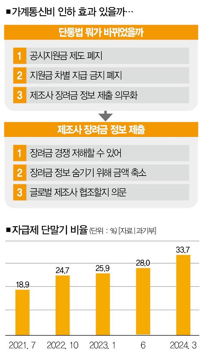 ■ 바뀌긴 바뀔까 = 하지만 개정안의 효과가 눈에 띄지 않을 것이란 비관론도 적지 않다. 이유가 있다. 개정안에 추가된 '제조사 장려금 관련 자료 제출 의무 조항' 때문이다. 제조사 장려금이란 특정 단말기를 판매한 대가로 제조사가 이통사 대리점에 지급하는 돈이다. 이 조항을 도입하면 단말기 제조사는 정부에 장려금 자료를 제출해야 한다.