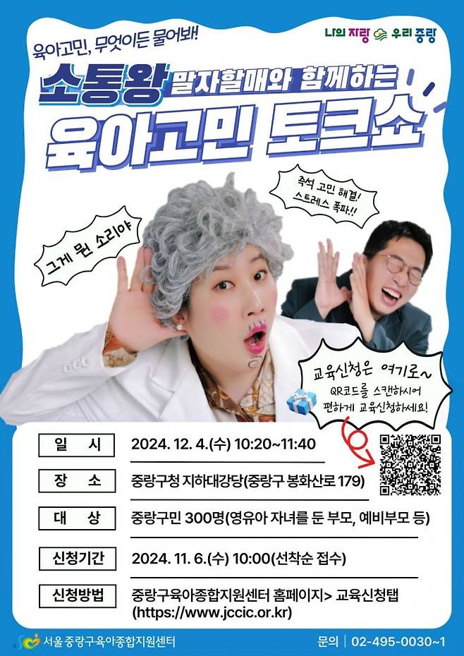 중랑구(구청장 류경기) 육아종합지원센터가 12월 4일 구청 지하대강당에서 '소통왕 말자할매 육아 고민 토크쇼'를 개최한다.