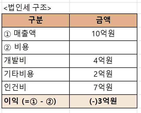 예를 들어 플랫폼을 운영하는 스타트업이 있으며, 매출액은 10억, 개발비는 4억, 기타비용은 2억, 내부직원 인건비가 7억인 경우 법인세와 부가가치세의 세액산정 구조는 하기와 같다.