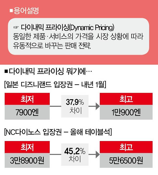 직장인 배수현(32)씨는 올겨울 친구와 일본 도쿄 디즈니랜드 여행을 계획하고 있다. 디즈니랜드 입장권 가격을 알아보던 배씨는 셈법이 복잡해졌다. 12월 입장권 가격은 날짜별로 9400엔에서 1만900엔까지 차이가 났고, 1월엔 7900~1만900엔으로 가격 편차가 더 컸기 때문이다. 가장 저렴한 금액과 가장 비싼 금액의 차이가 37.9%나 된 셈이다.