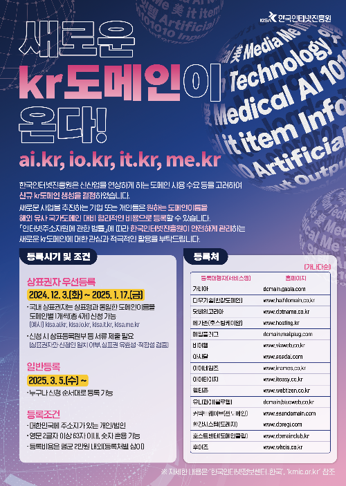 국내에서 새로운 사업을 추진하는 기업이나 개인은 국가도메인 'ai.kr' 'io.kr' 'it.kr' 'me.kr'을 사용할 수 있게 된다.