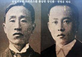 | ▲ 대구 조양회관에 전시되어 있는 장인환, 전명운 지사의 사진이다. 두 지사는 1908년 3월 22일 대한제국 외교 고문인 친일 미국인 스티븐스를 저격하여 처단했다. |