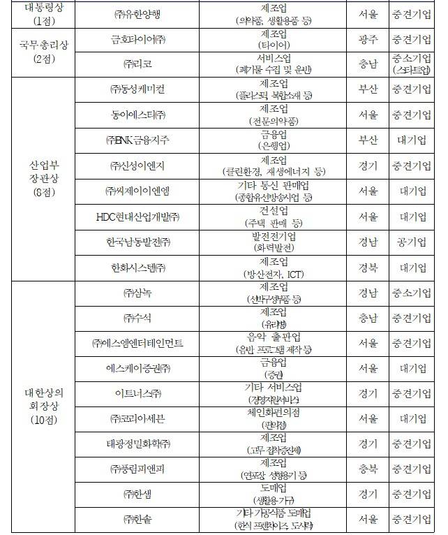 박일준 대한상의 상근부회장은 "위기를 기회로 삼는 발상의 전환과 과감한 투자로 획기적인 혁신을 이룬 중견·중소기업들의 활약이 특히 돋보였다"며 "디지털 대전환이라는 변화의 물결 속에서 끊임없는 혁신과 도전 정신으로 글로벌 시장을 선도하는 우리 기업들이 더욱 많아지기를 기대한다"고 말했다.