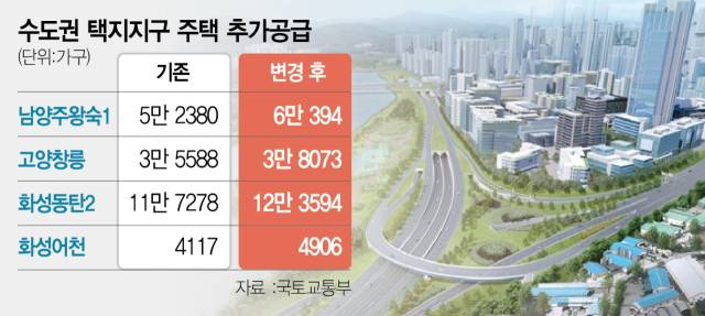 3기 신도시 이외 공공주택지구 공급 물량도 커지고 있다. 국토부는 10월 경기 화성시 일대에 조성되는 화성어천지구의 주택 공급량을 기존 4117가구에서 4906가구로 789가구로 늘리는 내용의 개발계획 변경을 승인했다. 주택건설용지 규모가 기존 약 22만 ㎡에서 약 24만 ㎡로 늘어나는 대신 자족시설(7만 ㎡→6만 ㎡)과 녹지(9만 ㎡→7만 ㎡) 등의 면적이 줄어든다. 이 밖에 2027년을 목표로 구리시 일대에 들어서는 구리갈매역세권 공공주택지구 내 주택 물량도 토지 이용 효율화 등을 통해 6162가구에서 6320가구로 확대하기로 했다.