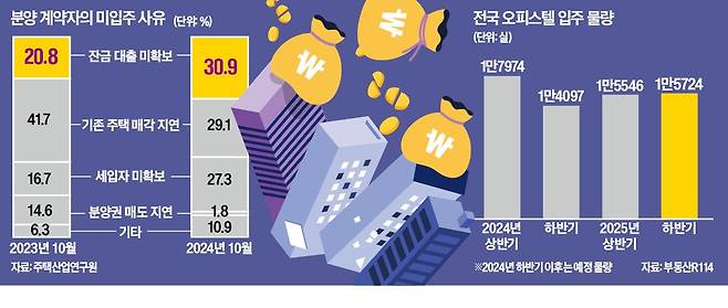 부동산시장 침체와 가계대출 관리 강화 등의 영향으로 집단대출 문턱이 높아져 입주를 앞둔 오피스텔, 레지던스(생활숙박시설) 등 비아파트 계약자의 잔금 마련에 비상이 걸렸다. 아파트와 달리 이른바 ‘수익형 부동산’은 대출이 막히면 자금을 구할 방도가 딱히 없다. 대출 옥죄기에 따른 입주 차질로 시행사와 건설사 등이 연쇄적으로 부실화할 것이라는 우려가 크다.