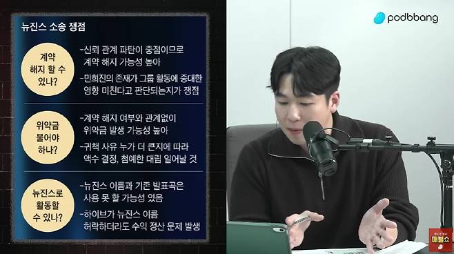 그는 '어도어가 뉴진스를 상대로 활동정지 가처분 신청을 낼 것인가'에 대한 질문에는 "어도어에게 여론적으로 부담이 큰 부분일 것"이라며 "어도어 입장에서는 뉴진스를 지키고 발전시키겠다고 표명했는데 활동 정치 가처분 신청이라는 강수를 둔다는 건 또 다른 파탄의 징후로 인정될 수 있어서 전략적으로 어려울 수 있다"고 전했다.