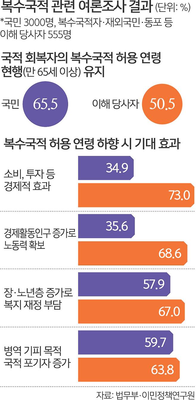 법무부가 산하 이민정책연구원 연구 용역을 통해 올해 8월 국민 3000명, 국내외에 거주하는 복수국적자와 외국인인 재외동포, 해외에 장기 거주하는 재외국민 등 이해 당사자 555명을 대상으로 ‘복수국적 및 국적 이탈·상실에 대한 여론조사’를 온라인으로 실시한 결과, 국민 응답자 65.5%는 ‘지금처럼 만 65세 이상 국적 회복자에게만 복수국적을 허용해야 한다’고 답했다. ‘지금보다 낮춰야 한다’는 응답은 나머지 34.5%였다. 이해 당사자 50.5%도 ‘지금처럼 허용해야 한다’고 했다.