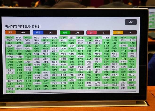 우원식 국회의장은 4일 오전 1시 6분 국회 본회의에서 비상계엄 해제 요구안을 상정했다. 투표 결과, 재적 의원 190명 전원이 찬성하면서 안건이 통과됐다. 윤 대통령이 계엄령을 선포한 지 2시간 30분 만이다.