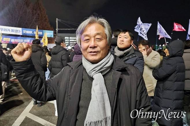 국회의 비상계엄 해제 요구안 통과 직후인 4일 오전 2시께 서울 영등포구 국회의사당 정문 앞에서 만난 박 상임이사는 시민들 사이에서 "윤석열을 체포하라", "내란죄로 체포하라" 등의 구호를 외치고 있었다.