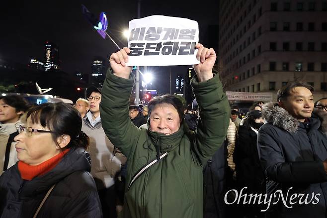 | ▲ 윤석열 대통령이 비상계엄을 선포한 뒤 국회가 비상계엄 해제 결의안을 통과시켰다. 수많은 시민들이 국회의사당 인근에 모인 가운데 한 시민이 "비상계엄 중단하라"라고 적힌 종이를 들고 있다. |