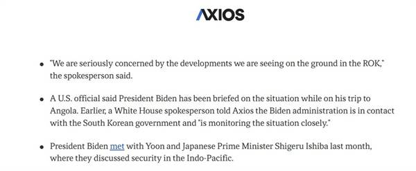 | ▲ 미국 <악시오스>에 따르면 미국 백악관 국가안전보장회의 대변인은 해당 매체에 "미국 정부는 윤석열 대통령의 계엄 선포에 대해 사전에 통보를 받지 못했다"라며 "미국 정부는 한국에서 목격되고 있는 상황에 대해 심각하게 우려하고 있다"고 말했다. |
