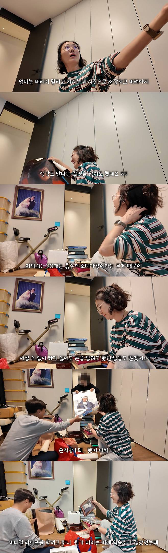 오연수는 "엄마는 버리지 말라고 하시는데 사진으로 저장하고 버릴 거다. 이고 지고 있어봤자 먼지만 쌓이고 짐만 될 것 같다"고 말했다. 사진을 보던 그는 "몇 년 있으면 40년 일을 해서 생각도 안 나는 촬영을 많이도 했다"며 손지창과 함께 옛날 사진을 보며 웃음을 지었다.