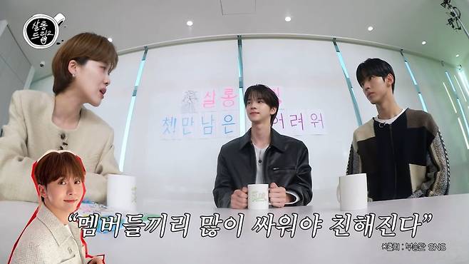 선배 아이돌인 세븐틴 승관은 "멤버끼리 많이 싸워야 친해진다"는 조언을 했다고. 도훈은 "저희가 그런 얘기 듣기 전까지 한 번도 안 싸웠는데 흡수력이 좋아서 그 말 듣자마자 화나는 거 있으면 바로 말했다. 어제도 긴 대화를 했다"고 전해 웃음을 자아냈다. 장도연이 "승관 씨 말이 맞는 거 같냐"고 하자 신유는 "투어스도 투어스만의 해결방안이 있을 것 같고 세븐틴 선배님들도 세븐틴 선배님들만의 방법이 있는 것 같다 싸우는 것만이 방법은 아닌 것 같다"라고 답했다. 장도연이 "세븐틴은 깡패인데 투어스는 아니니까 적당히 알아서 하겠다는 것"이라고 너스레를 떨자 투어스는 손사래를 쳤다.