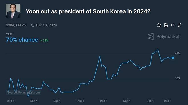 4일 폴리마켓에는 전날 윤 대통령의 비상 계엄령 선포 이후 관련 베팅들이 7개 가량 열렸다. 오전 8시 기준 "윤 대통령이 연내 퇴임할 것인가"라는 질문에는 약 32만 달러의 베팅이 이뤄졌으며, 퇴진 가능성은 64%로 평가됐다.