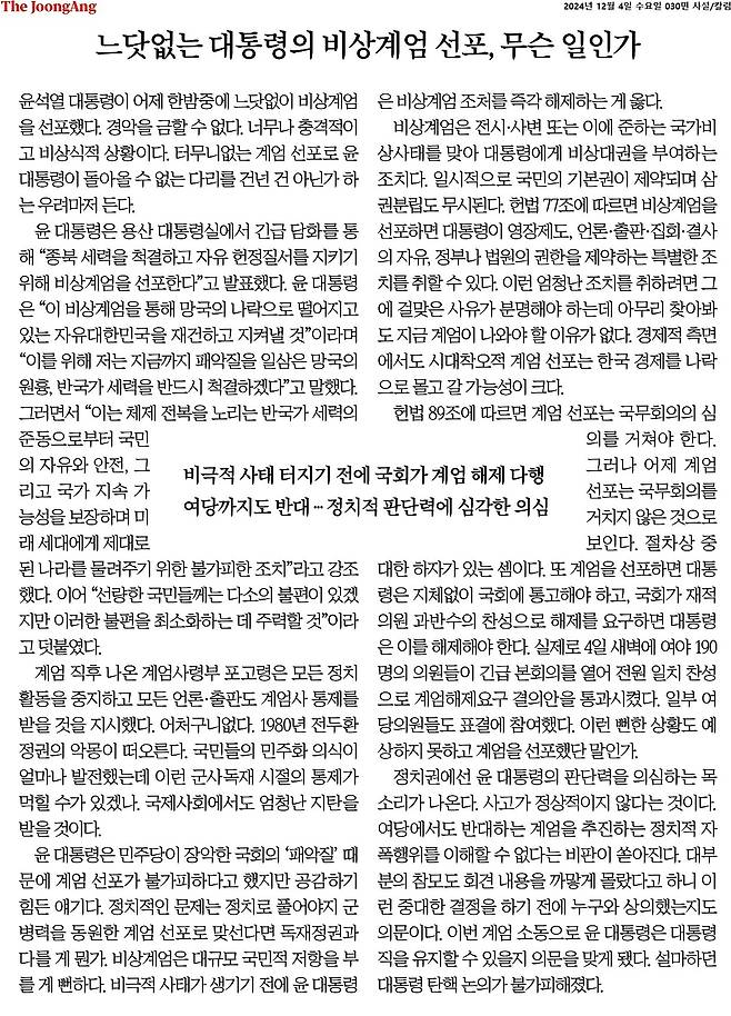 | ▲ <중앙일보> 4일자 사설 '느닷없는 대통령의 비상계엄 선포, 무슨 일인가' |
