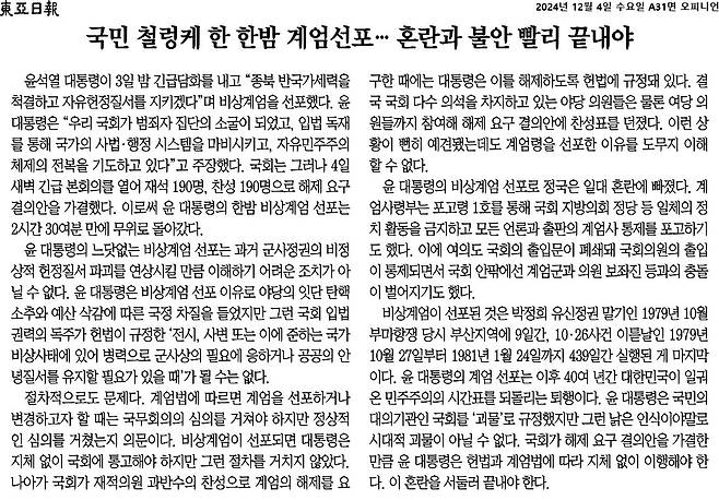 | ▲ <동아일보> 사설 '국민 철렁케 한 한밤 계엄선포... 혼란과 불안 빨리 끝내야' |