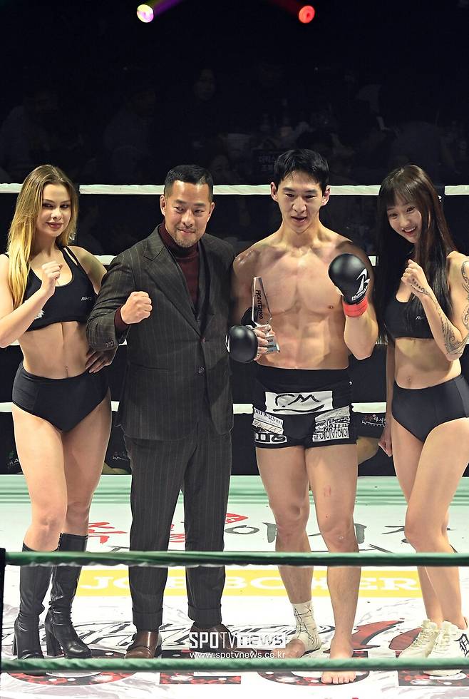 [스포티비뉴스=박성기 기자] 유튜버 밴쯔(본명 정만수)가 지난달 29일 서울 서초구 세빛섬 플로팅 아일랜드에서 열린 '파이터100 클럽 002'에서 격투기 선수로 데뷔해, 일본 격투기 선수인 카츠에게 승리를 거둔 후, 라운드걸 아니아(Ania Korczak)와 아이돌네이션(본명 김혜수)와 포즈를 취하고 있다.