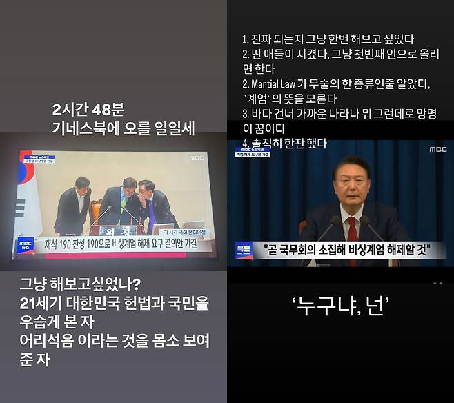 이어 "그러나 조금 전 국회의 계엄 해제 요구가 있어 계엄 사무에 투입된 군을 철수시켰다. 바로 국무회의를 통해 국회의 요구를 수용해 계엄을 해제할 것"이라며 "다만, 즉시 국무회의를 소집했지만, 새벽인 관계로 의결정족수가 충족되지 못해서 오는 대로 계엄을 해제하겠다"고 설명했다.