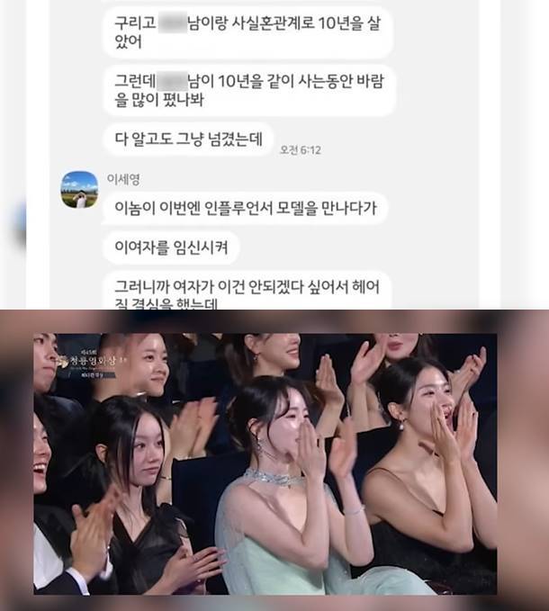 앞서 온라인 커뮤니티, SNS 등에는 모 법무법인 직원으로 보이는 여성 A씨가 지인들에게 보낸 메시지 내용이 퍼졌다. 이에 따르면 회계사인 여성 B씨가 모 로펌에서 법률상담을 받았는데, B씨는 정우성과 10년 사실혼관계인 여자였다고. B씨는 회계사이며, 유부녀였으나 정우성과 만나면서 이혼했다고.