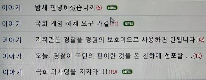 윤석열 대통령의 느닷없는 비상계엄 선포로 전국의 경찰 지휘관들이 비상근무에 돌입한 상황에서 '국민과 국회를 지켜야 한다'는 현장 경찰관들의 호소가 동료들의 공감을 샀다.