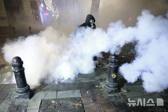 [트빌리시=AP/뉴시스] 4일(현지시각) 조지아 트빌리시에서 정부의 유럽연합(EU) 가입 협상 중단 결정을 규탄하는 시위 중 한 시위자가 방독면을 쓰고 경찰이 발사한 최루 가스 사이를 지나가고 있다. 2024.12.04.
