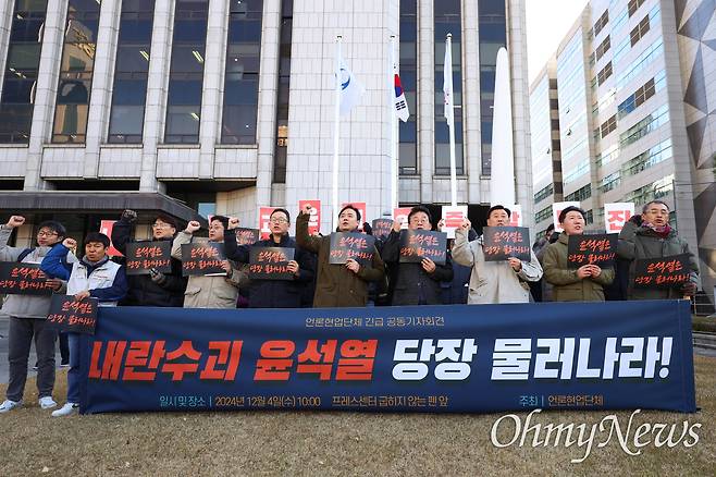 | ▲ ‘내란수괴 윤석열! 즉각 퇴진과 구속 수사 촉구 긴급 기자회견’이 4일 오전 서울 중구 프레스센터앞에서 언론현업단체(언론노조, 한국기자협회, 방송기자연합회, 한국영상기자협의회, 한국기술인연합회) 주최로 열렸다. |