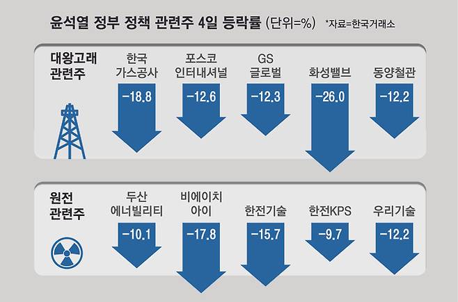 윤 대통령의 대표 사업인 ‘대왕고래 프로젝트’ 관련주와 정부가 키우던 원전 섹터 등이 두자릿수 하락률을 나타냈다.