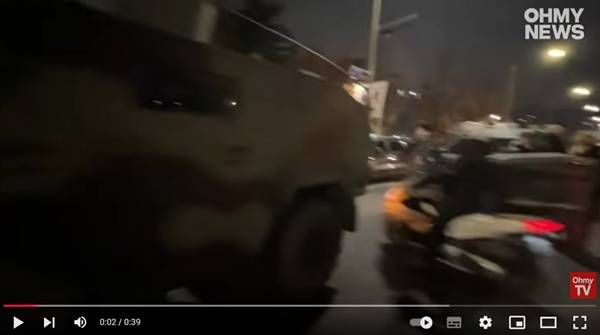 | ▲ 오마이TV의 ‘[계엄 실시간] 국회 앞에 나타난 계엄군’ 유튜브 영상 캡처본. 장갑차 사이로 오토바이를 탄 배달 기사가 지나가는 모습이다. |