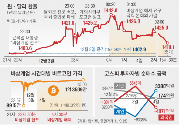 한편 비트코인 가격은 빠른 회복세를 보였다. 업비트에선 윤 대통령이 비상계엄을 선포한 직후 비트코인 가격이 전날 대비 34% 폭락하며 8800만원까지 곤두박질쳤다. 예상치 못한 소식에 투매가 있었고 가상자산 거래소 앱 접속도 지연된 탓이다. 비상계엄이 해제된 오전 4시 30분 다시 1억 3000만원선을 회복했다.