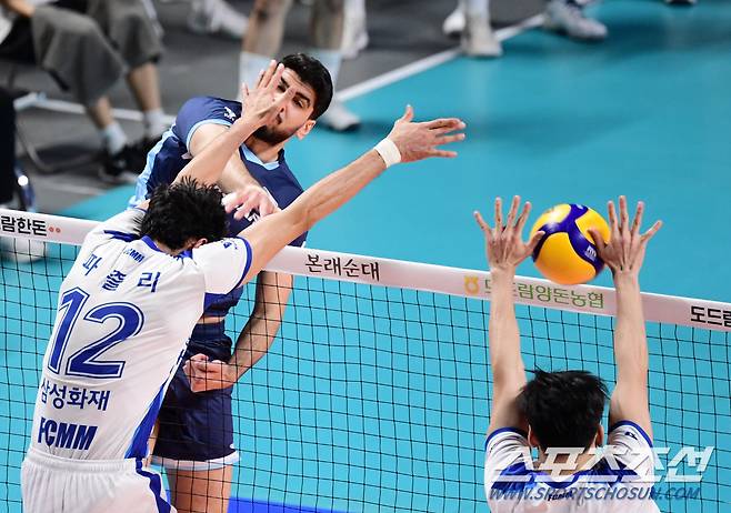 4일 서울 장충체육관에서 배구 V리그 남자부 우리카드와 삼성화재의 경기가 열렸다. 우리카드 알리가 삼성화재 블로킹을 앞에 두고 스파이크를 날리고 있다. 장충동=송정헌 기자songs@sportschosun.com/2024.12.04/
