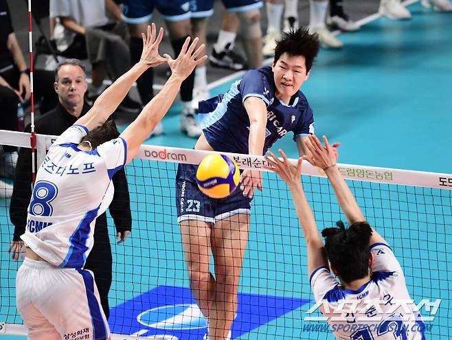 4일 서울 장충체육관에서 배구 V리그 남자부 우리카드와 삼성화재의 경기가 열렸다. 우리카드 김형근이 삼성화재 블로킹을 앞에 두고 스파이크를 날리고 있다. 장충동=송정헌 기자songs@sportschosun.com/2024.12.04/