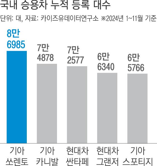 카이즈유데이터연구소가 4일 국내 완성차 5사의 올 1~11월 신차 등록 대수를 집계한 결과, 1위는 8만6985대가 팔린 쏘렌토가 차지했다. 2위는 기아 카니발로 7만4878대가 국내에 판매됐다. 현대차 싼타페는 7만2577대가 팔리며 3위를 기록했다.