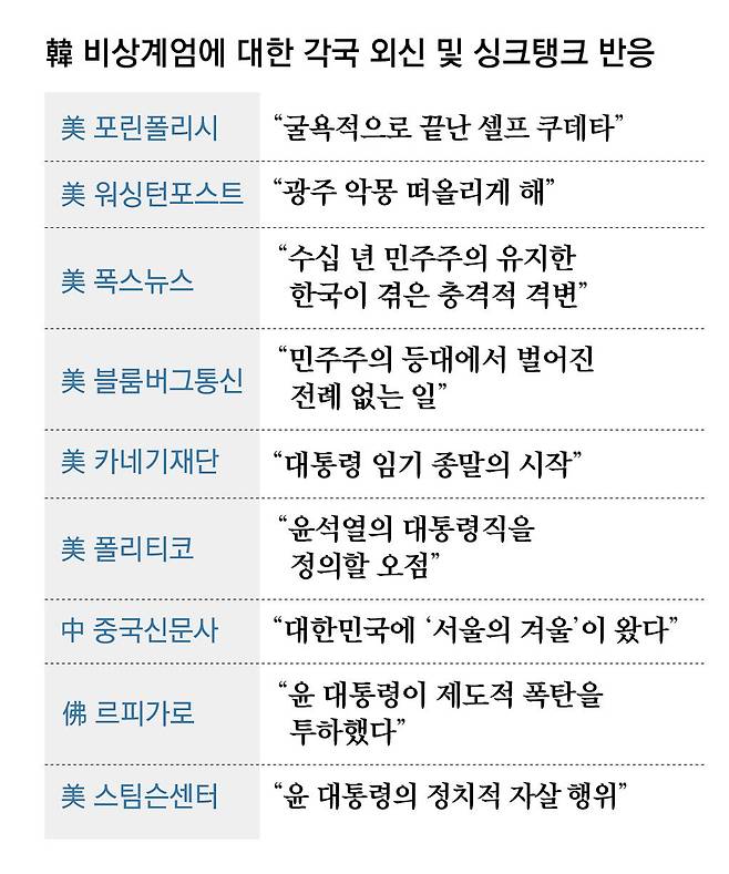 유명 싱크탱크도 계엄 선포에 부정적인 평가를 내놓았다. 로버트 매닝 스팀슨센터 선임연구원은 “윤 대통령의 정치적 자살 행위”라고 평가했다. 안킷 판다 카네기국제평화재단 선임연구원은 “윤 대통령 임기 종말의 시작”이라고 내다봤다.