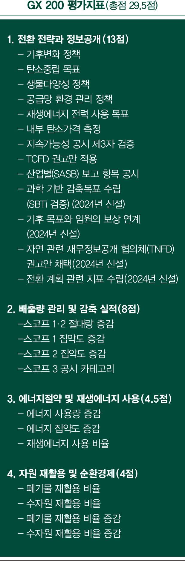에너지절약 및 재생에너지 사용 부문은 에너지 사용량 감축 비율, 매출 대비 에너지 집약도 감축 비율, 전체 에너지 사용량 대비 재생에너지 사용 비율 등을 점검했다. 자원 재활용 및 순환 경제 부문은 폐기물 및 수자원 재활용 비율, 수자원 사용량 감소 비율, 폐기물 재활용 증가 비율 등을 평가에 반영했다. 두 부문 배점은 9.5점으로 4개 부문 총점은 29.5점이다.