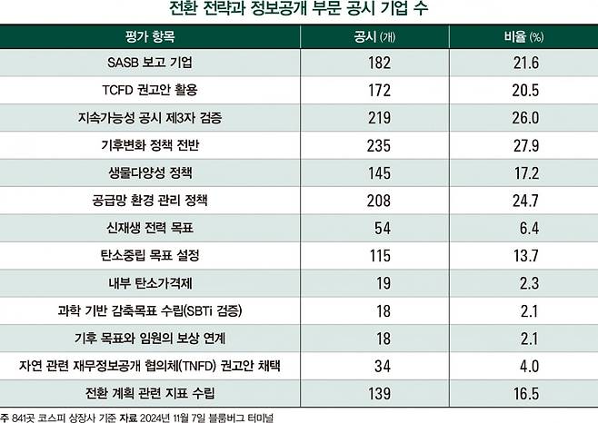 전환 전략과 정보공개 부문은 기업이 녹색 전환과 관련한 목표를 수립하고 관련 정보를 투명하게 공개하는지 여부를 살폈다. 탄소중립 목표 수립, 재생에너지 사용 목표 설정, 탄소가격 산정, 환경 공급망 관리 정책, 생물다양성 정책, 기후변화 대응 정책, 기후변화 관련 재무정보공개 협의체(TCFD) 권고안 활용, 산업별 공시 항목 준수(SASB 활용) 여부를 평가 항목에 넣었다.