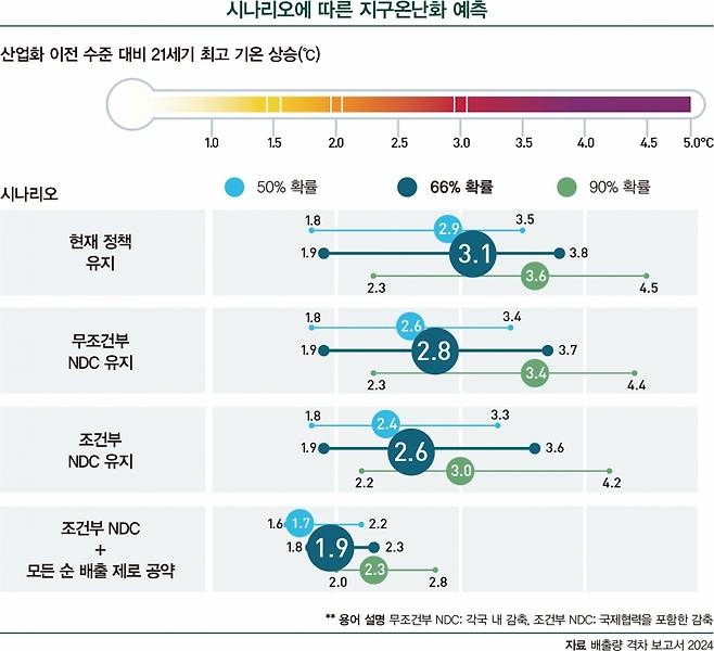2023년 온실가스배출량이 1.3% 증가해 57.1GtCO2-eq에 달하면서 2035년까지 매년 1.5℃ 경로를 위해 7.5%, 2℃ 경로를 위해 4%씩 감축해야 해 과제가 더욱 어려워졌다. UNEP는 각국이 자원과 역량을 이용해 달성하는 무조건적 NDC와 국제 협력이나 지원을 통해 달성하는 조건부 NDC가 모두 완전히 이행되더라도 2030년 예상 배출량이 10% 감소할 뿐이며, 2.6℃ 온도 상승이 예측된다고 밝혔다. 현재 계획된 정책만 이행할 경우 최대 3.1℃ 온도 상승이 발생할 것이라고 내다봤다. 지난해 보고서에서 제시된 최대 2.℃ 상승과 비교해 0.2℃ 더 높아졌다.